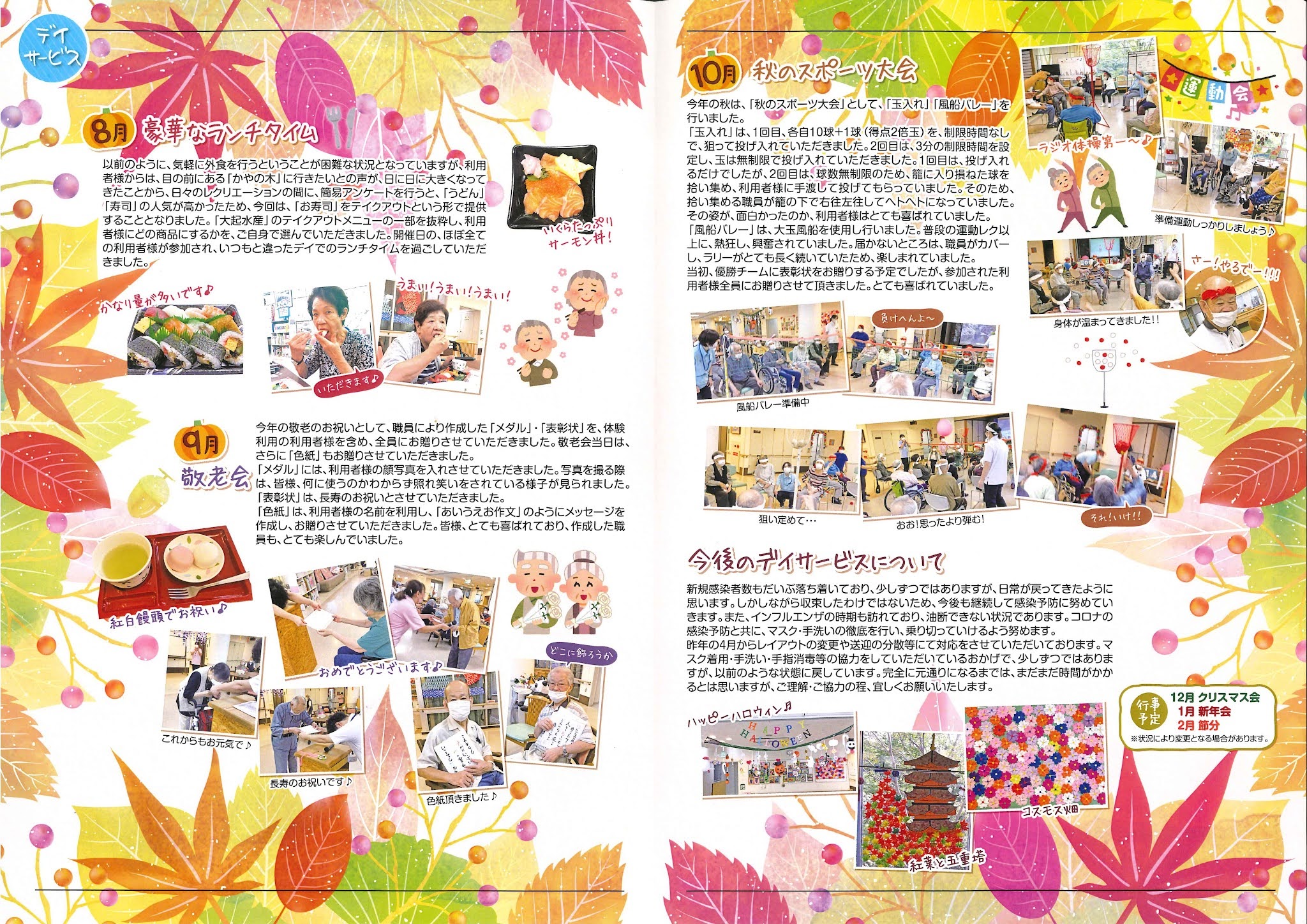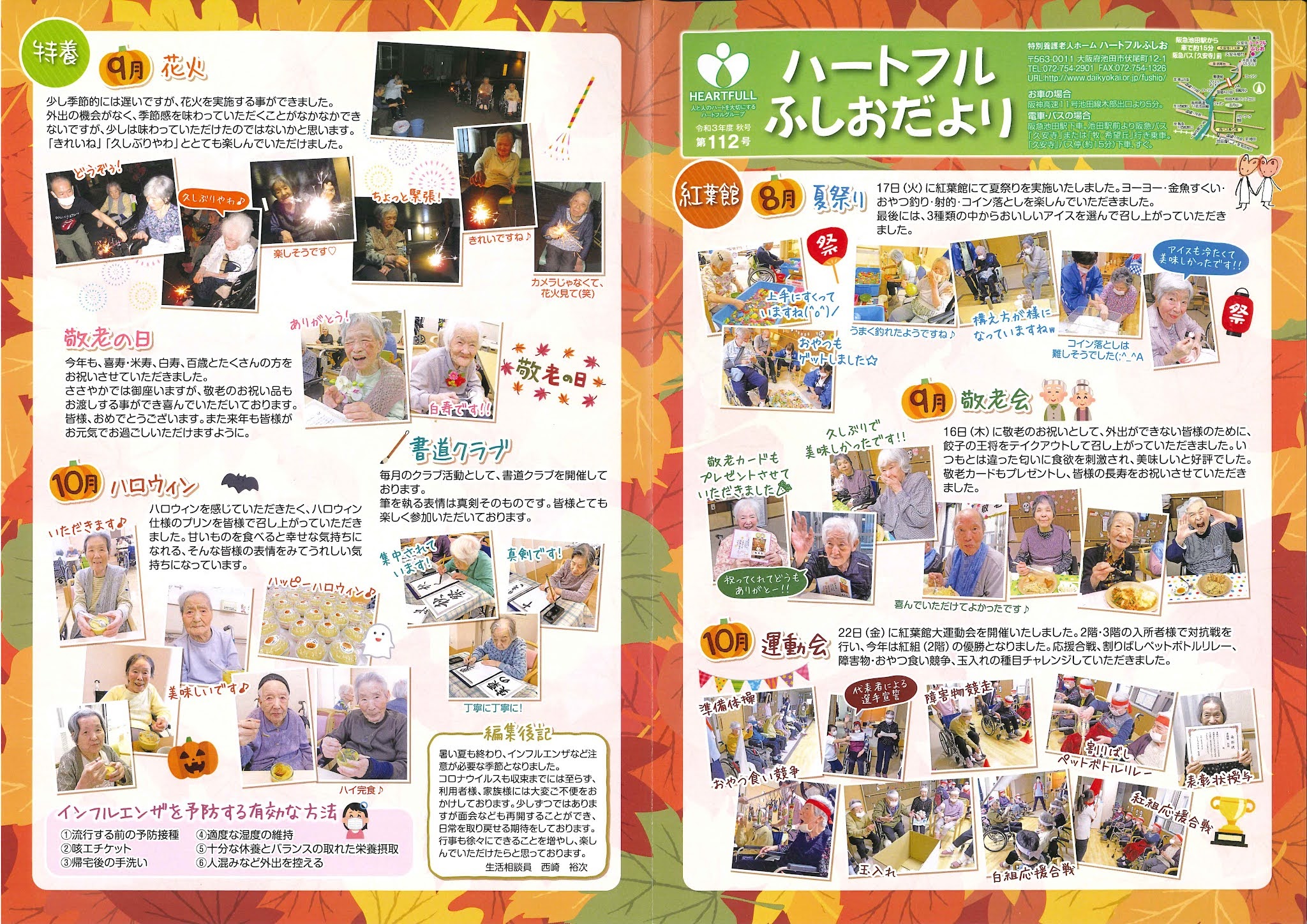 ハートフルふしおだより 発刊しました 2021年11月19日 最終更新日時 : 2021年12月17日 ハートフルふしお 112号を発刊いたしました。 ようやく、緊急事態宣言も明け、当施設におきましてもコロナ禍、以前の動きが徐々に変わっております。又、機関紙のように皆様に日々楽しんでいただけるように職員も試行錯誤の中で行っております。今後も皆様に安心して日常生活を送っていただけるように日々心掛けてまいりますので、よろしくお願いします。