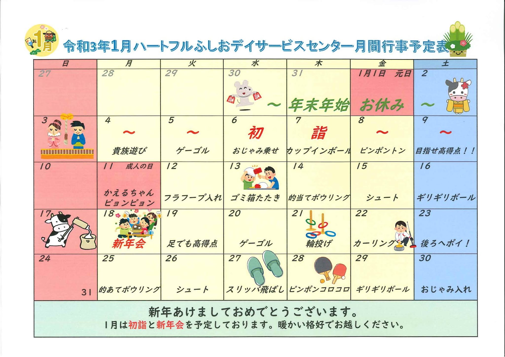 令和3年1月度 行事予定表・献立表を更新いたしました。 ~ハートフルふしお デイサービスセンター~