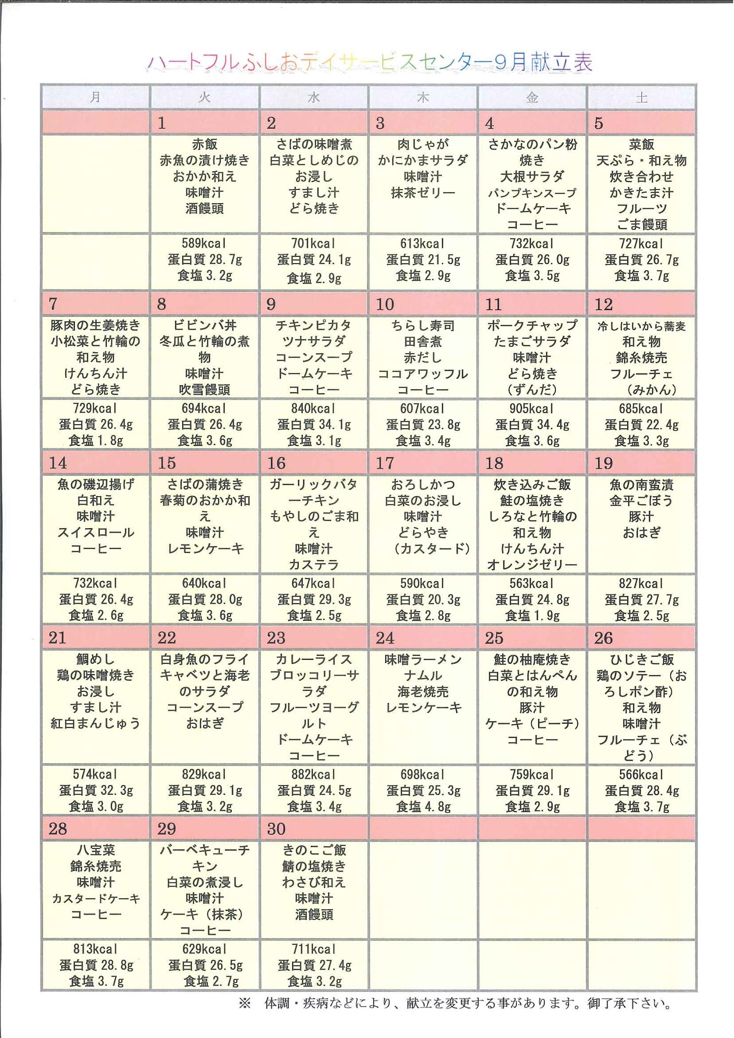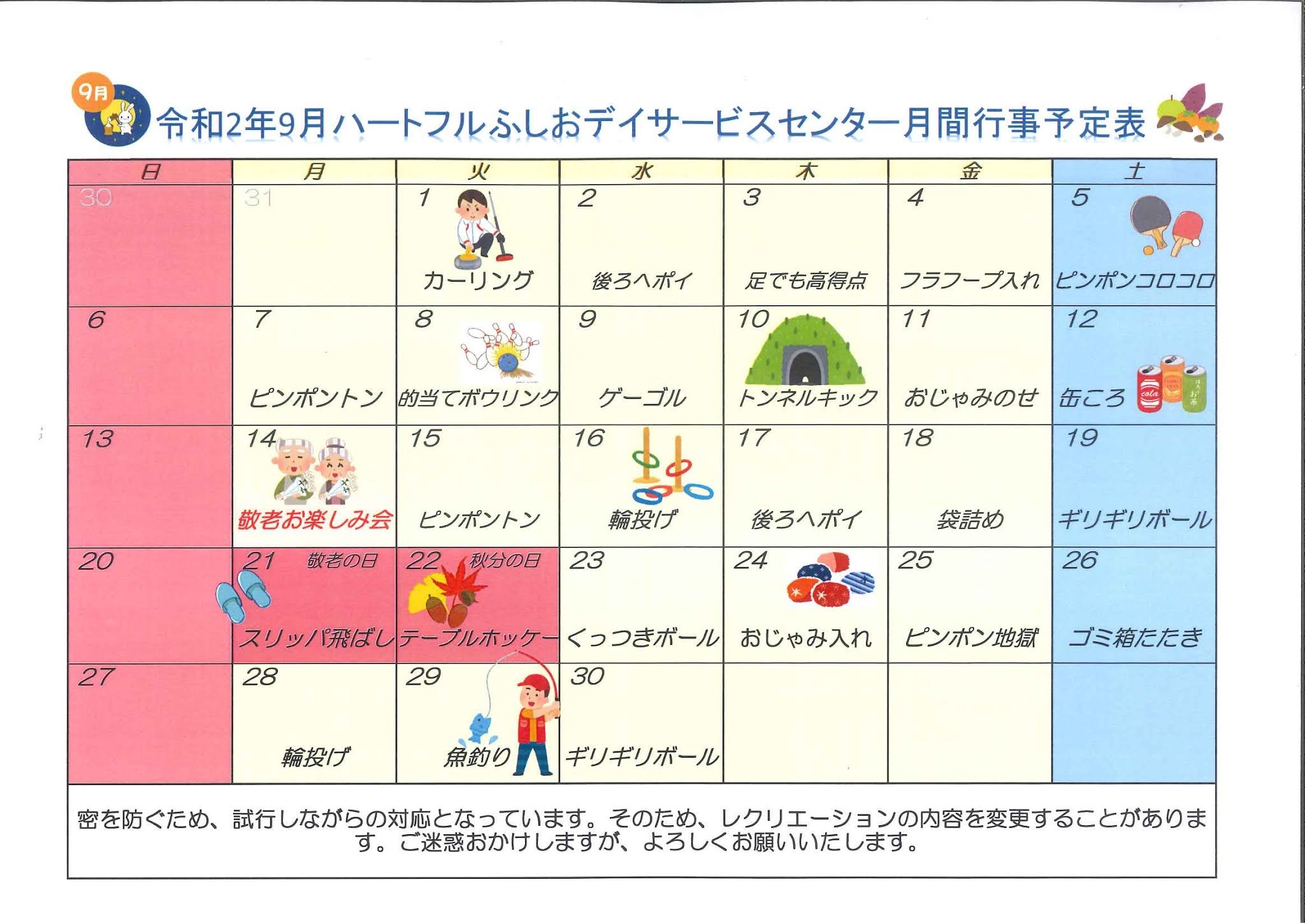 令和2年9月度 行事予定表・献立表を更新いたしました。 ~ハートフルふしお デイサービスセンター~