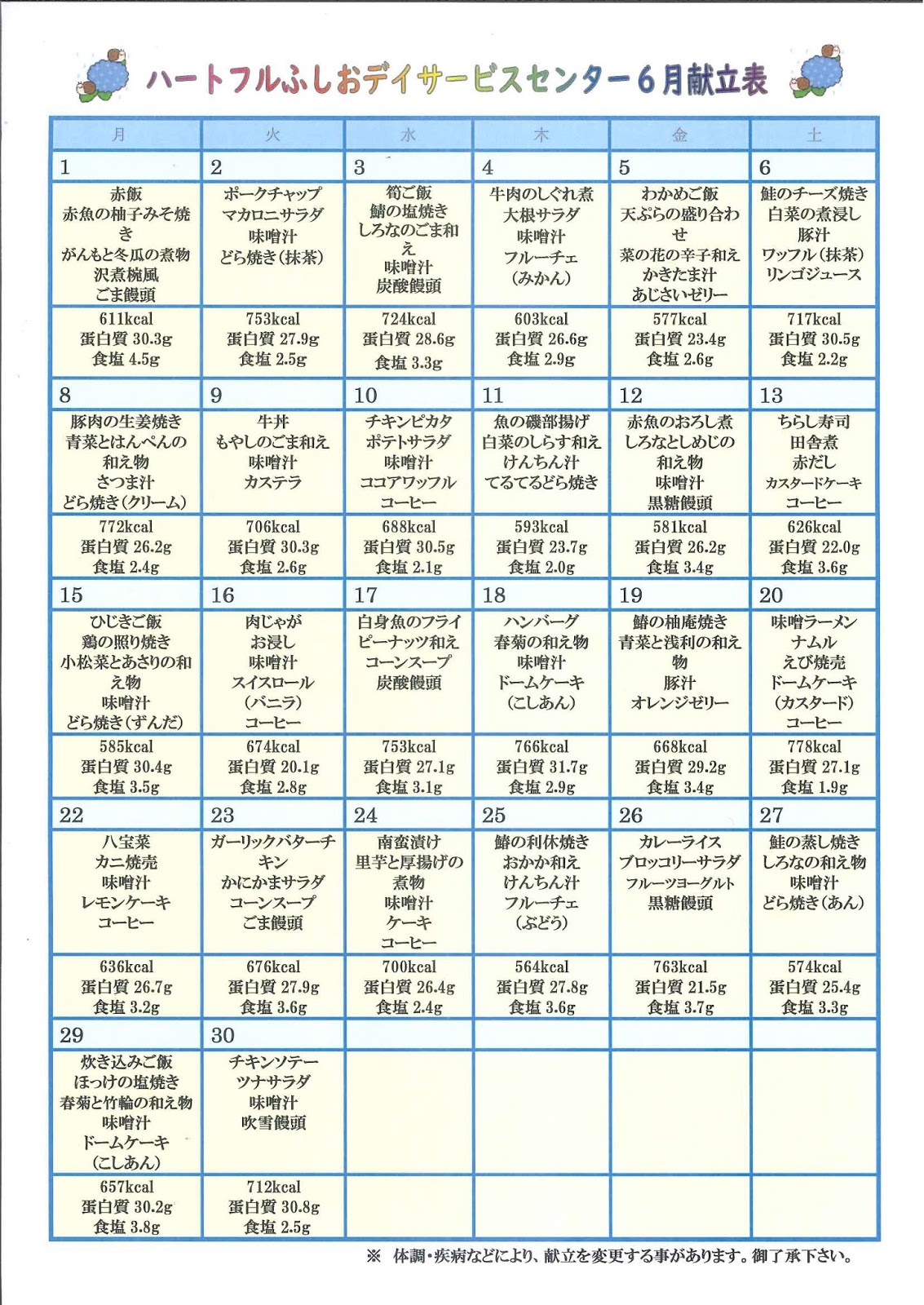令和2年6月度 行事予定表・献立表を更新いたしました。 ~ハートフルふしお デイサービスセンター~