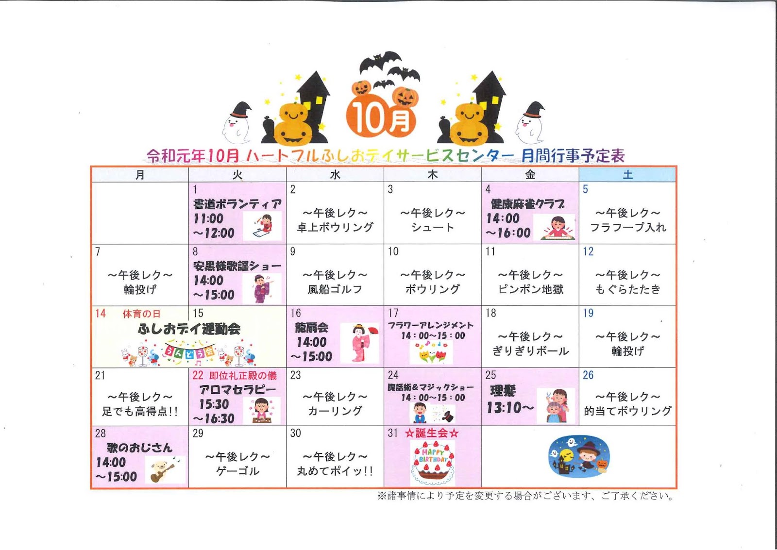 3. 令和元年10月度 行事予定表・献立表を更新いたしました。 ~ハートフルふしお デイサービスセンター~