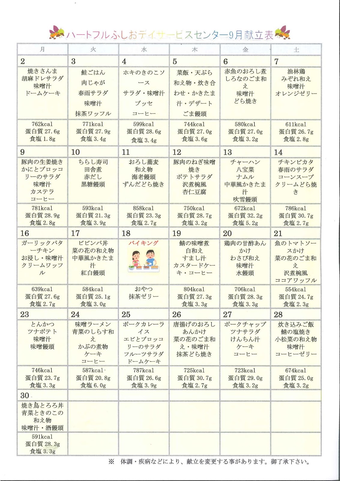 令和元年9月度 行事予定表・献立表を更新いたしました。 ~ハートフルふしお デイサービスセンター~