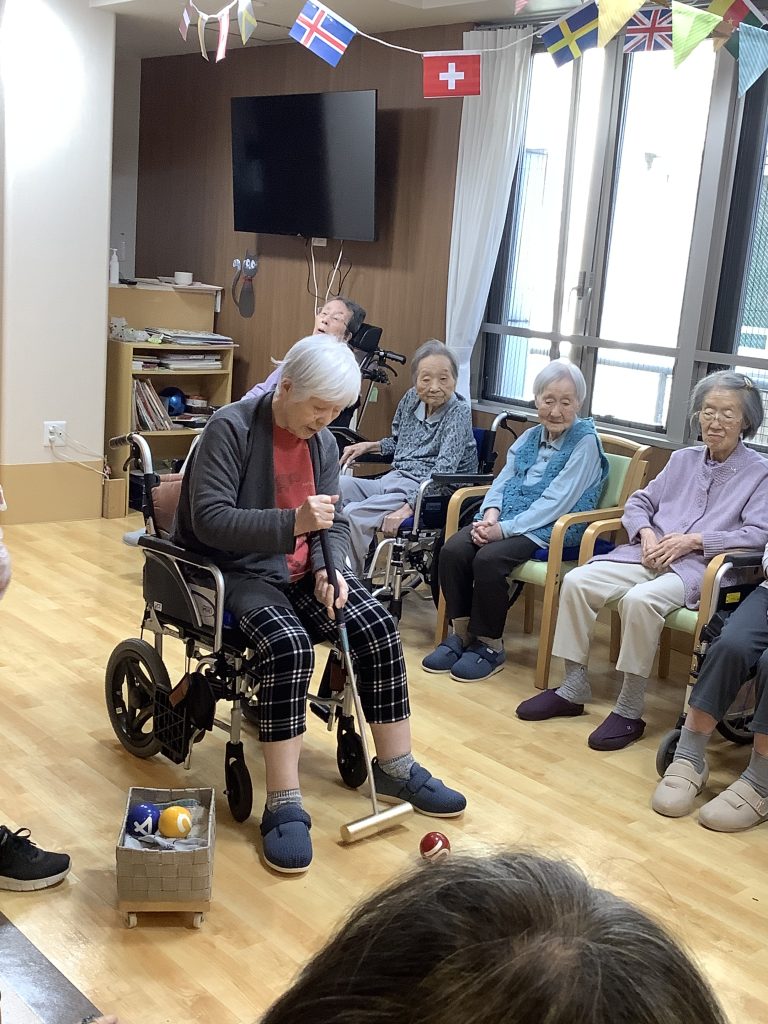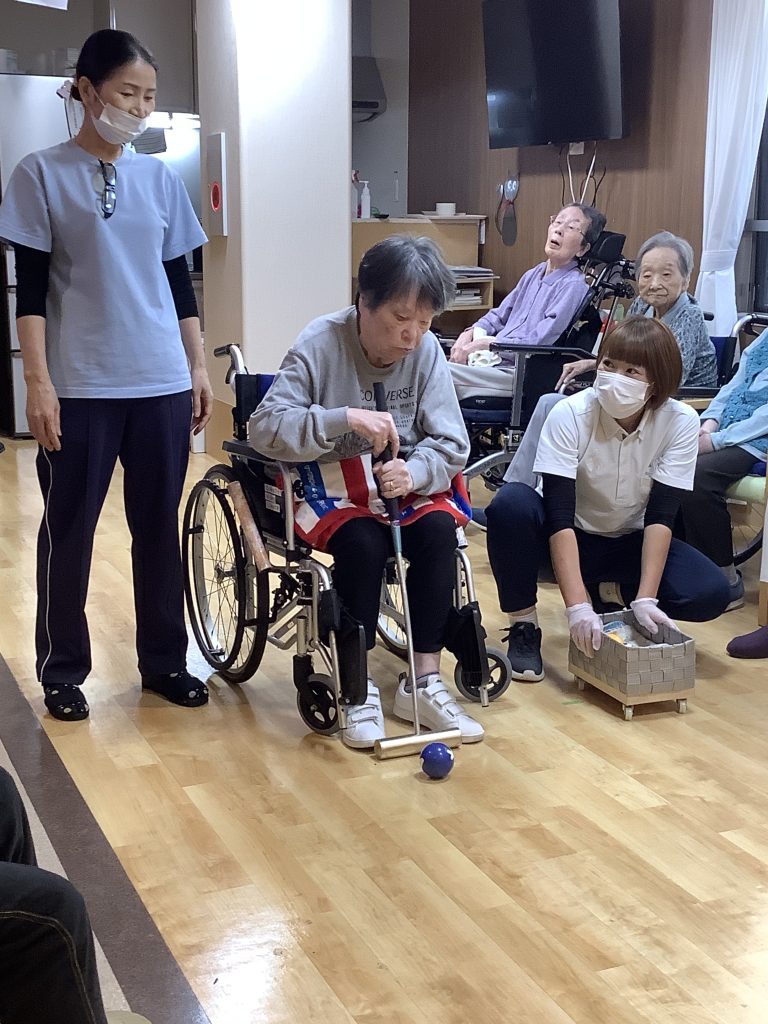 点数の書いてある的めがけてゲートボールの球を打ち込んでいただきました。皆様真剣に取り組んでおられました(^O^)/