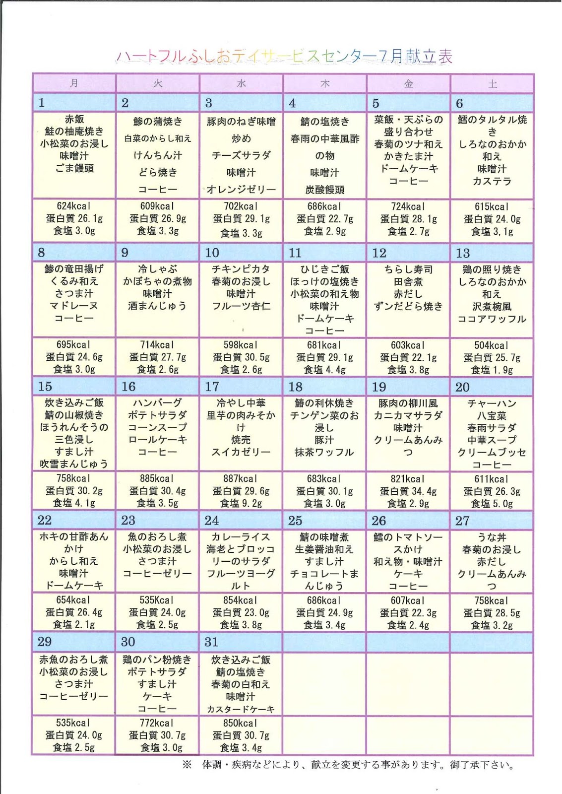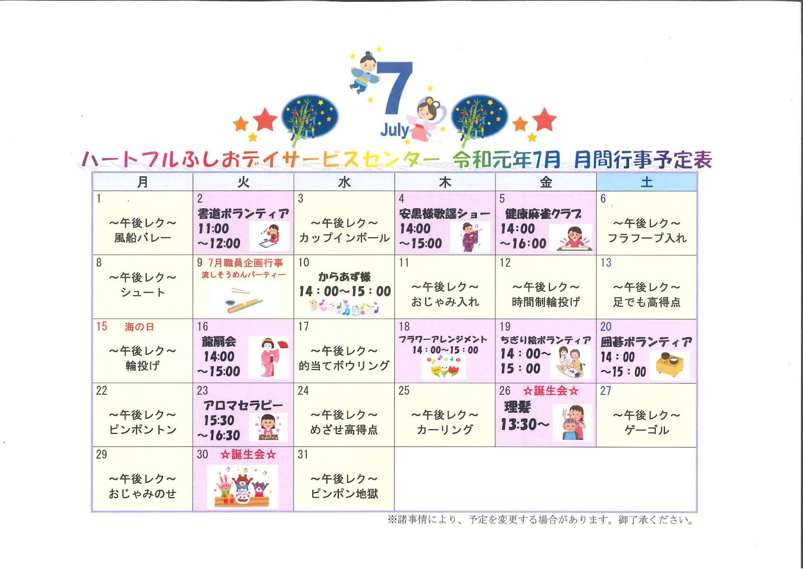 令和元年7月度 行事予定表・献立表を更新いたしました。 ~ハートフルふしお デイサービスセンター~