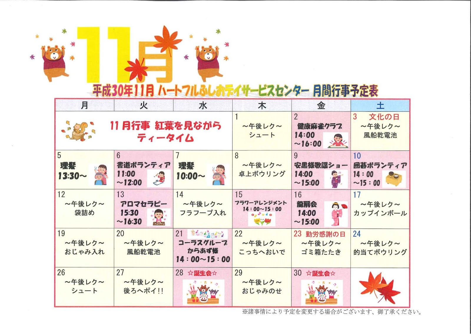 平成30年11月度 行事予定表・献立表を更新いたしました。 ~ハートフルふしお デイサービスセンター~
