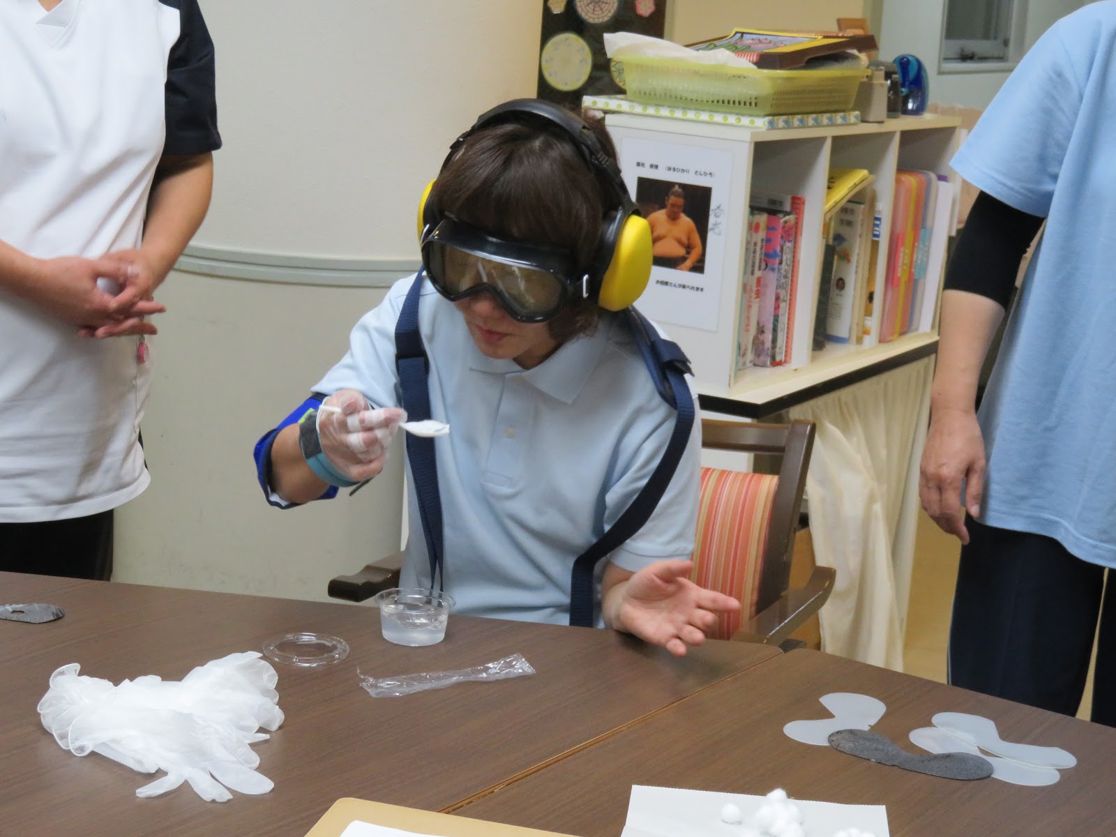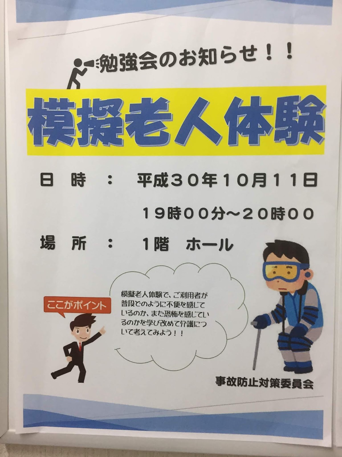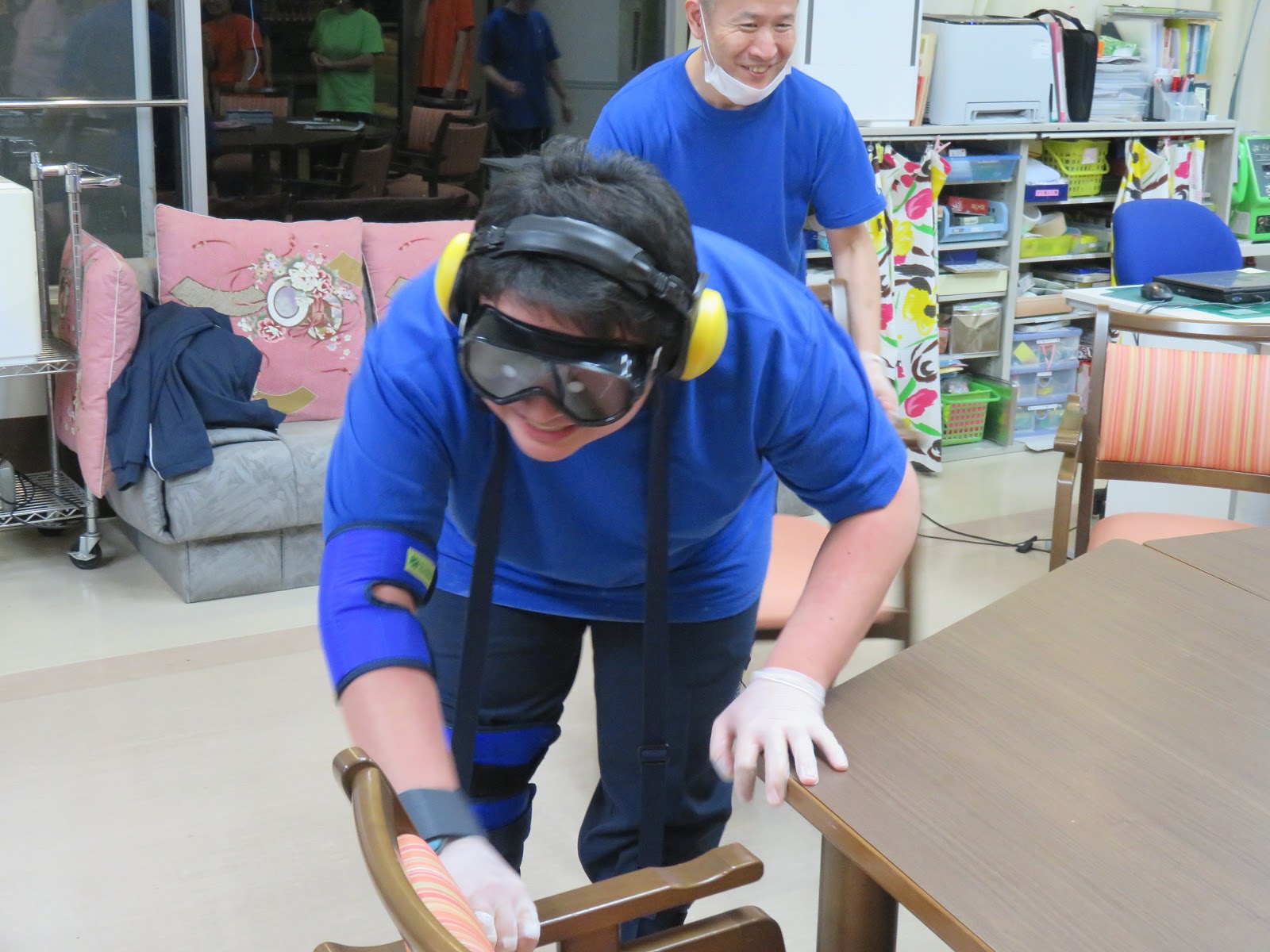 今回は『模擬老人体験』と題し、介護職員でお年寄りの体験をして