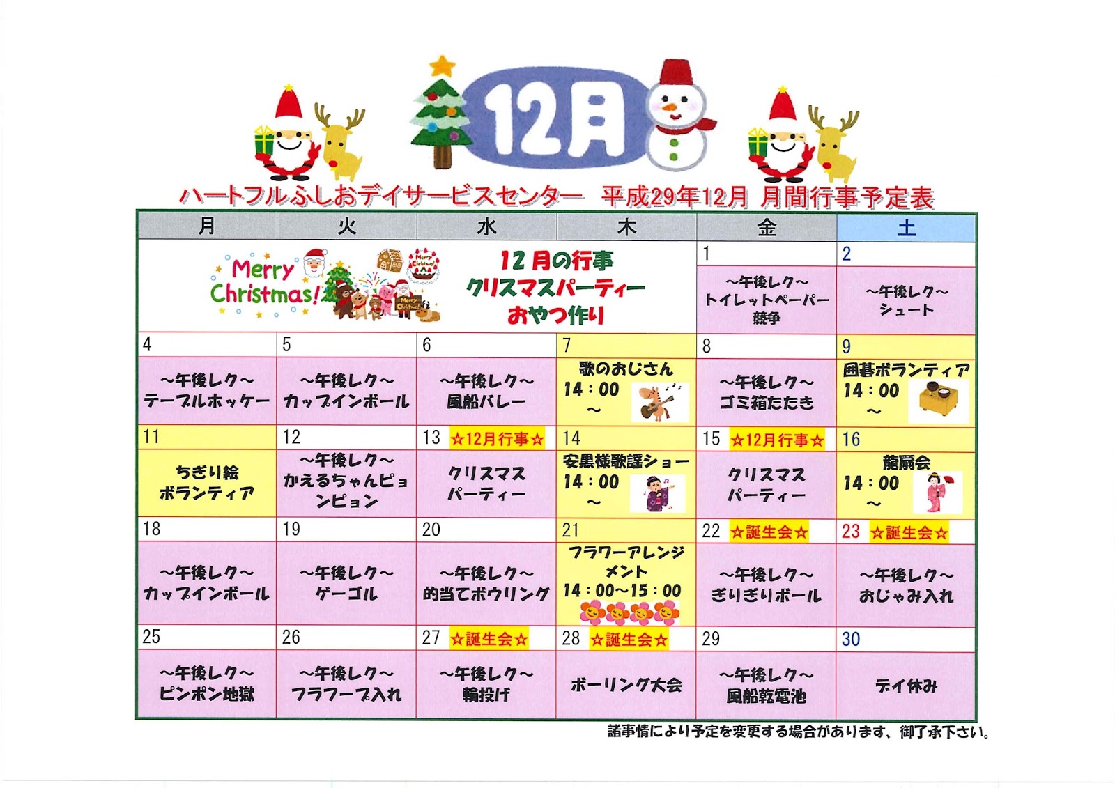 12月度 行事予定表・献立表を更新いたしました。 ~ハートフルふしお デイサービスセンター~