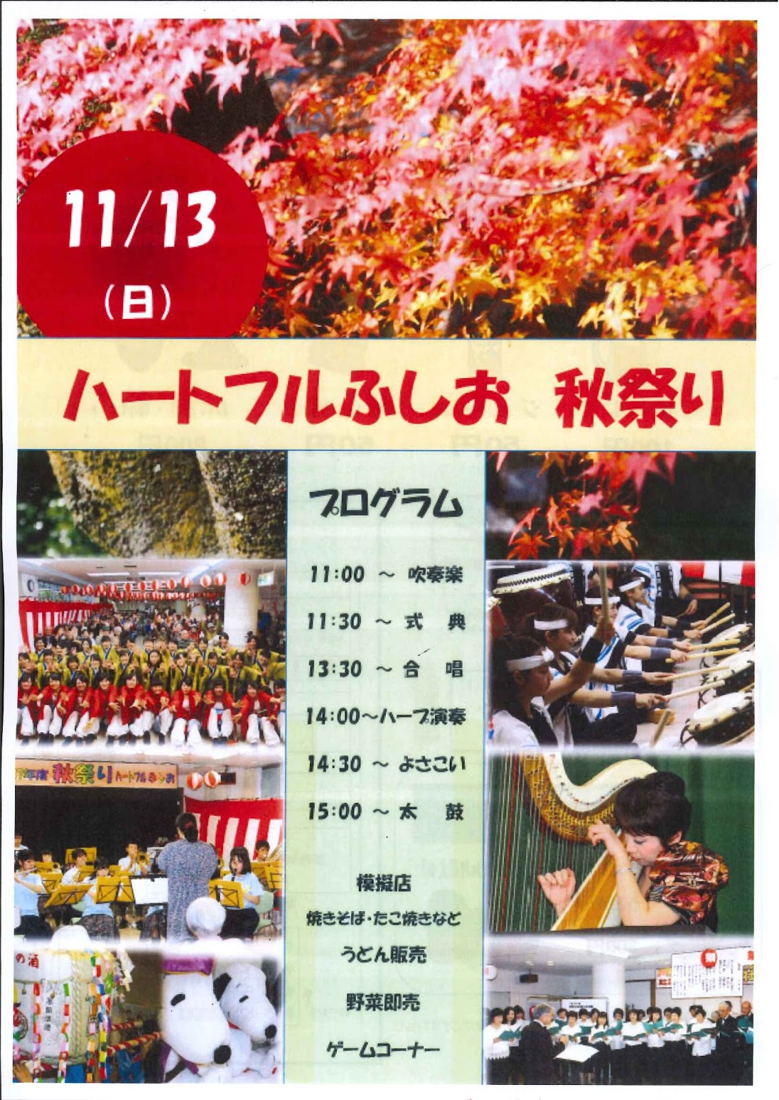 秋祭りを行いま~す!!! 2016年11月8日 最終更新日時 : 2021年12月17日 ハートフルふしお来たる 平成28年11月13日 日曜日 11:00~15:00ハートフルふしおにて第25回 秋祭りが開催されます。 気候のいい時期、皆様お誘いあわせの上、お越しくださいませ。(^o^)/~~~