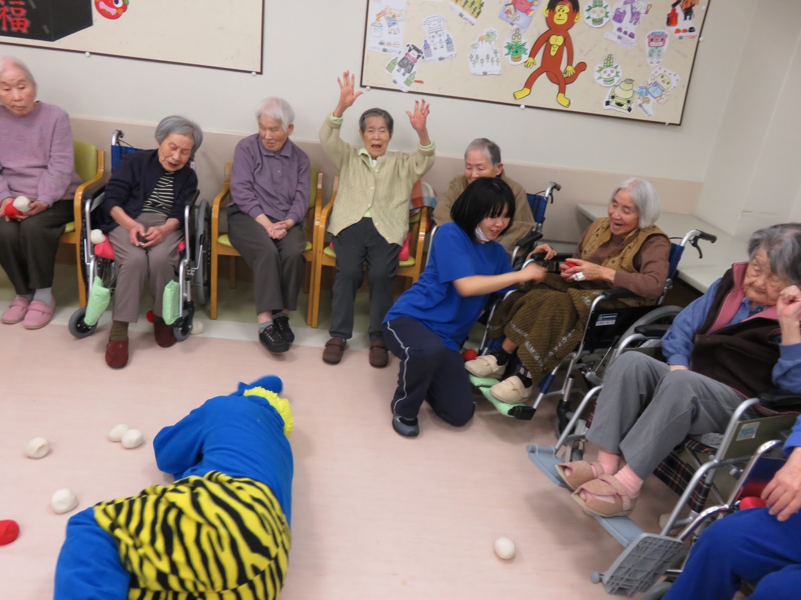 節分の日にちなんで 2016年3月4日 最終更新日時 : 2021年12月17日 ハートフルふしお皆様は いかがお過ごしでしょうか?ハートフルふしおでは 平成28年2月3日(水) 14:00~3階・2階食堂で節分の日にちなみ 職員が扮する鬼が登場し、豆に見立てた紅白玉を 片手に持ち、鬼を退治しました。