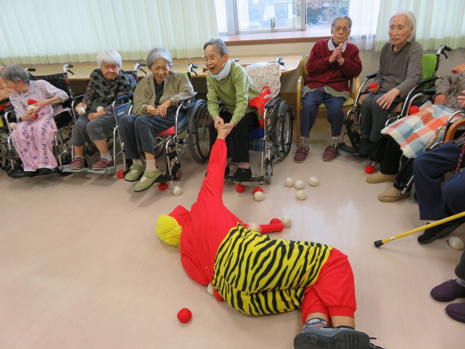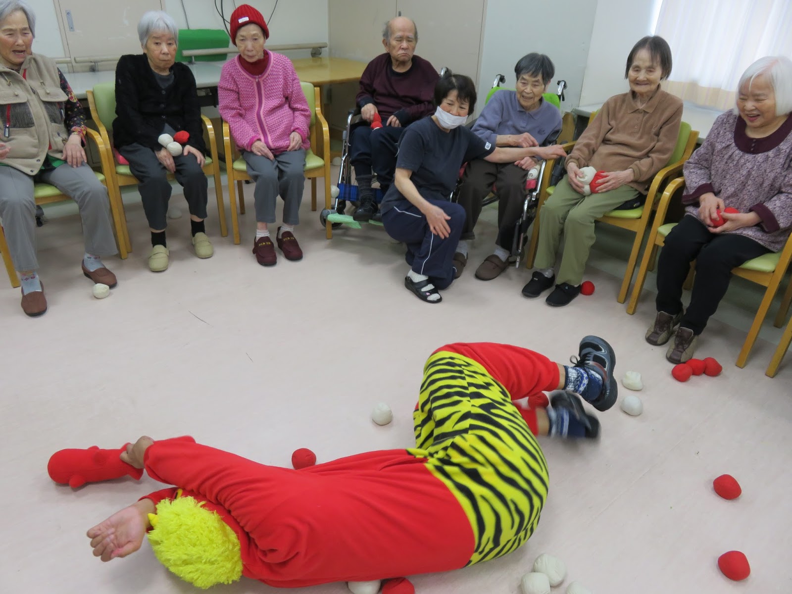 職員が扮する鬼が登場し、豆に見立てた紅白玉を