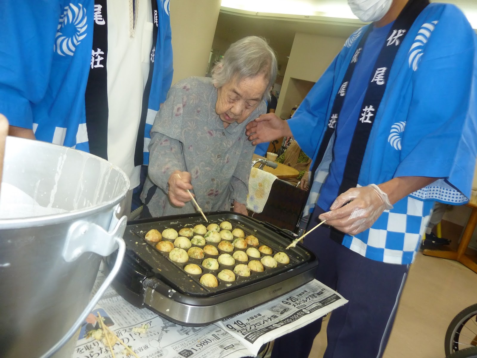 夏祭り開催しました ~ 特養~(*^◇^) 2015年8月27日 最終更新日時 : 2021年12月17日 ハートフルふしお平成27年8月25日 14:00~15:00 夏祭りを開催しました。 今年はたこ焼き屋台を開店し、ご利用者と共にたこ焼きを焼き、楽しいひと時を過ごしました。 昔、家でされていたのでしょうか? とても手際よく焼かれていましたよ。 v(^◇^)v ”私もさせて”とばかりに 職員と一緒に \(><)/ ”あんたもたこ焼きいるか~” (^m^)夫婦で久しぶりに食べるたこ焼きはおいしいわぁ~