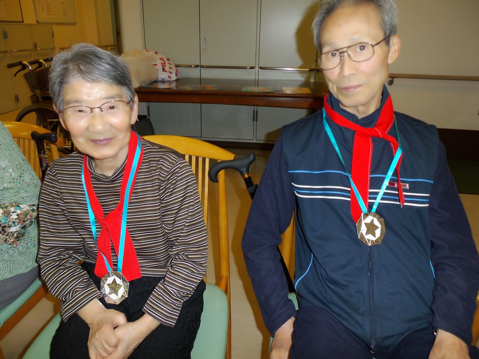 負けても勝っても皆で仲良く、メダルの贈呈!!!職員の手作りです。 |