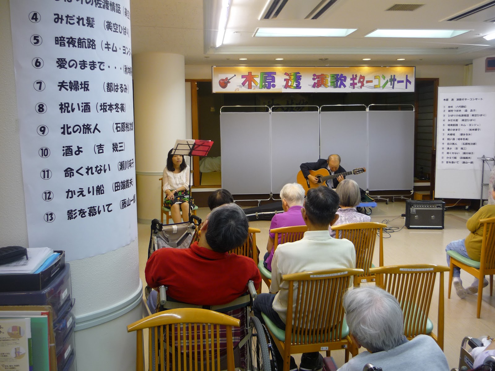 Untitled Post 2012年9月29日 最終更新日時 : 2021年12月17日 ハートフルふしお木原様ご夫妻のコラボ木原透様のギター演奏平成24年9月29日 伏尾荘ギター演奏会 木原様ご夫婦が伏尾荘にボランティアに来て、ギター演奏をしていただきました。 美しいギターの音色と奥様の澄み渡る歌声を聞かせていただきました。 利用者の皆様は上品で美しい音色に聞き入っておられました。