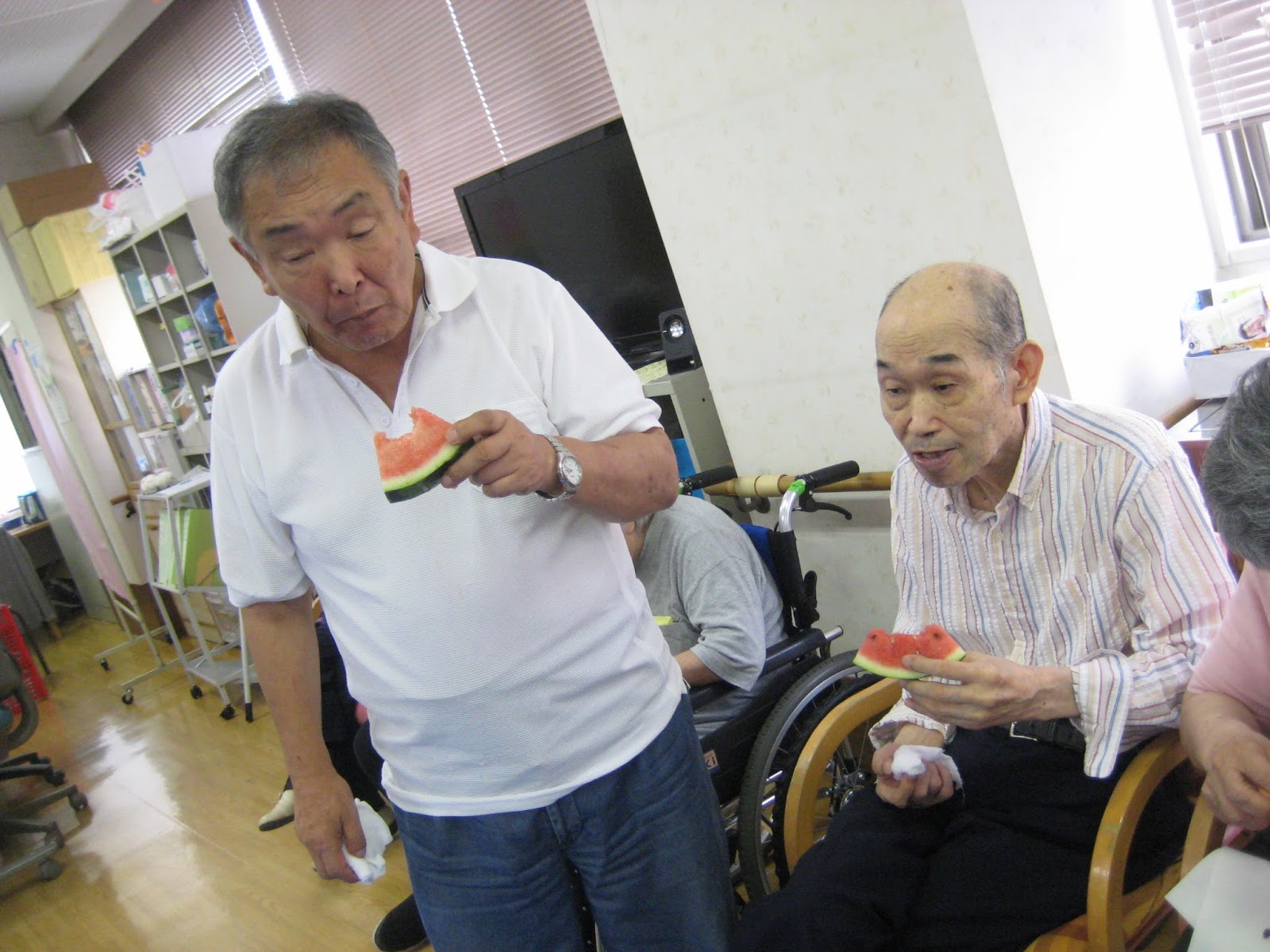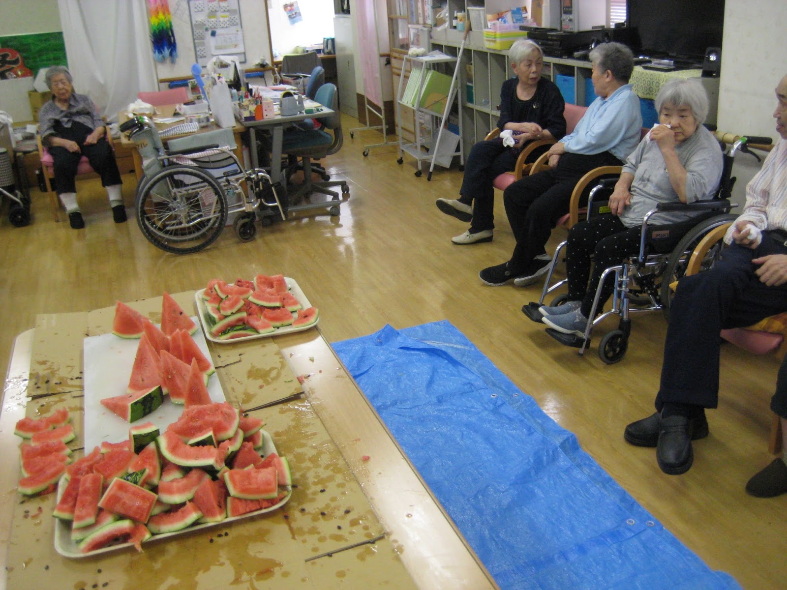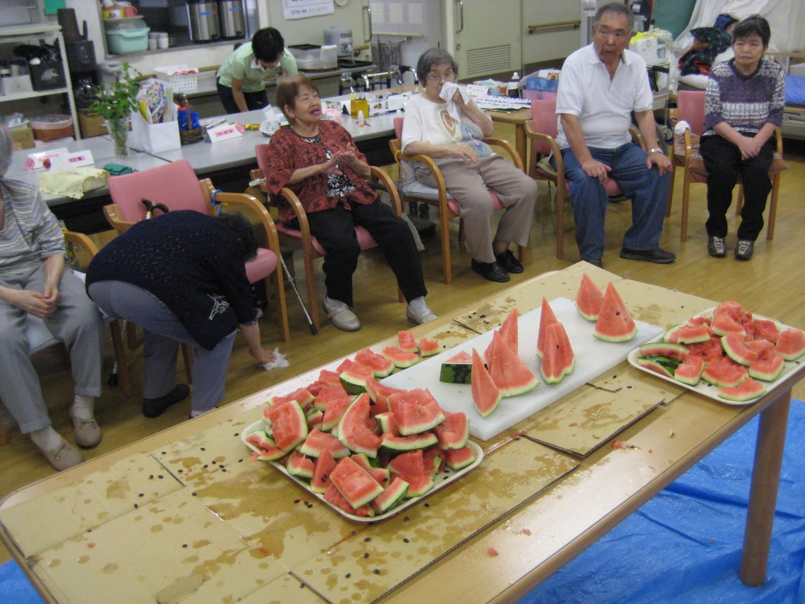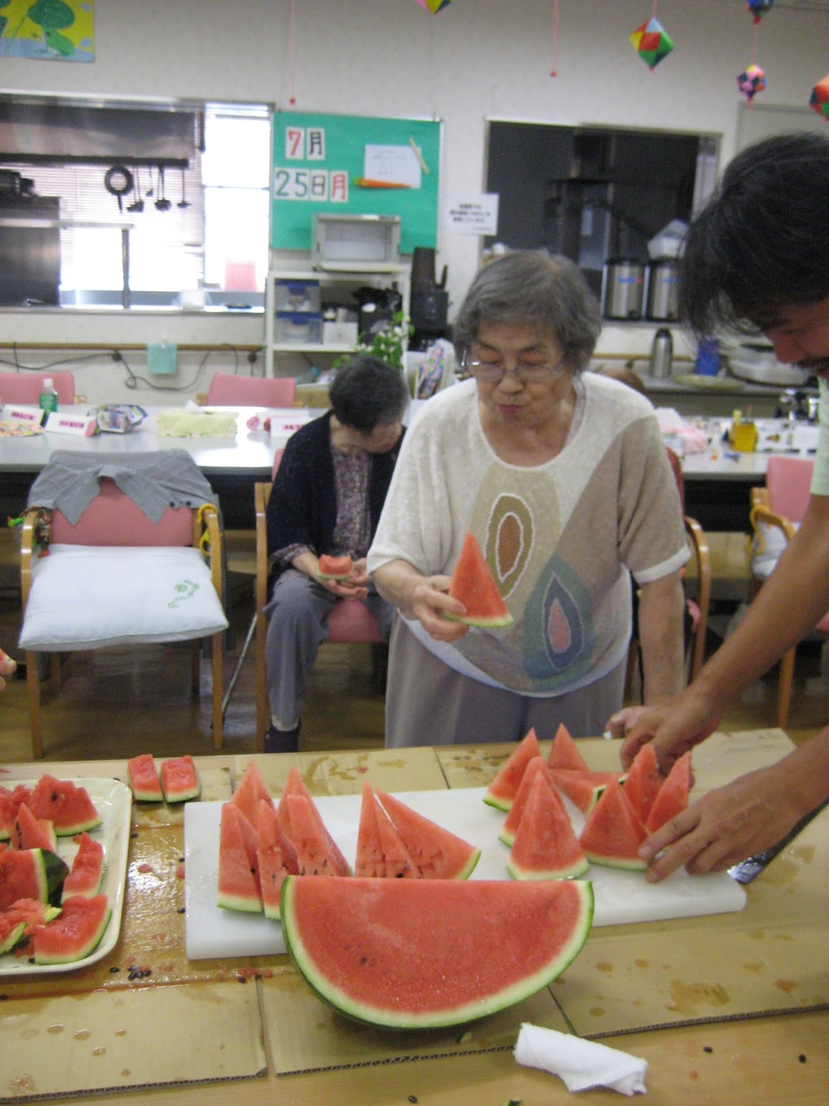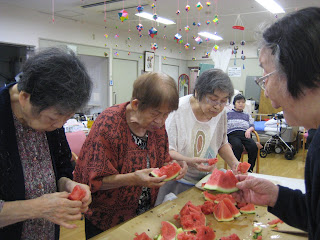 美味しい美味しいと、そばを離れない利用者さんもいれば普段は大人しい利用者さんもご自分から歩いてスイカを取りに行こうとしたりΣ(・∀・;)