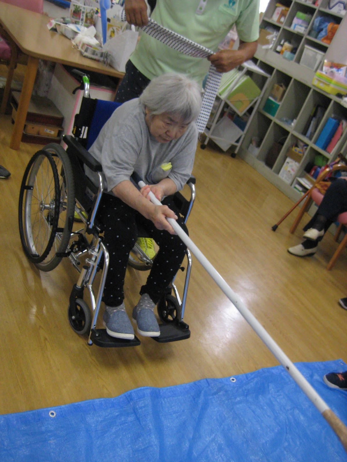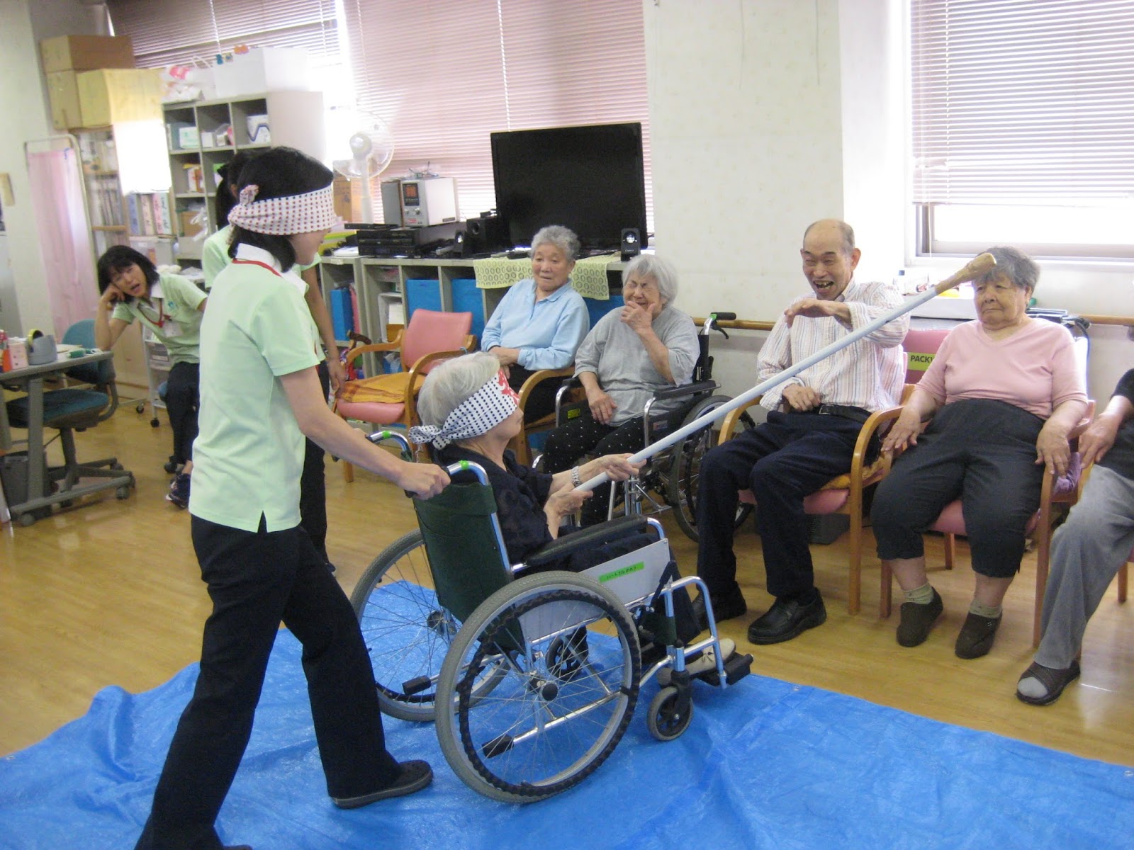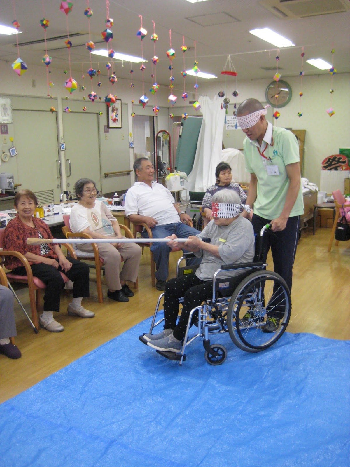 利用者さんに車椅子に座ってもらいスタッフが皆さんの右!左!の声を頼りに誘導します。もちろん二人共目隠ししてますよ♪