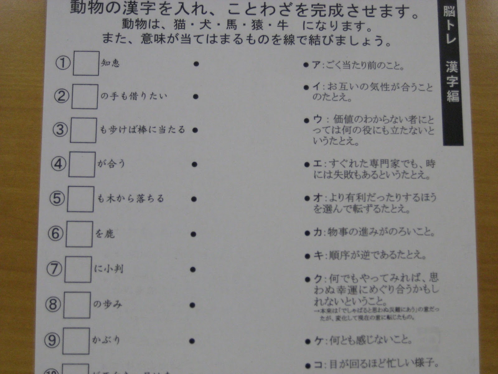 (動物の漢字を入れ、ことわざを完成させましょう)etc