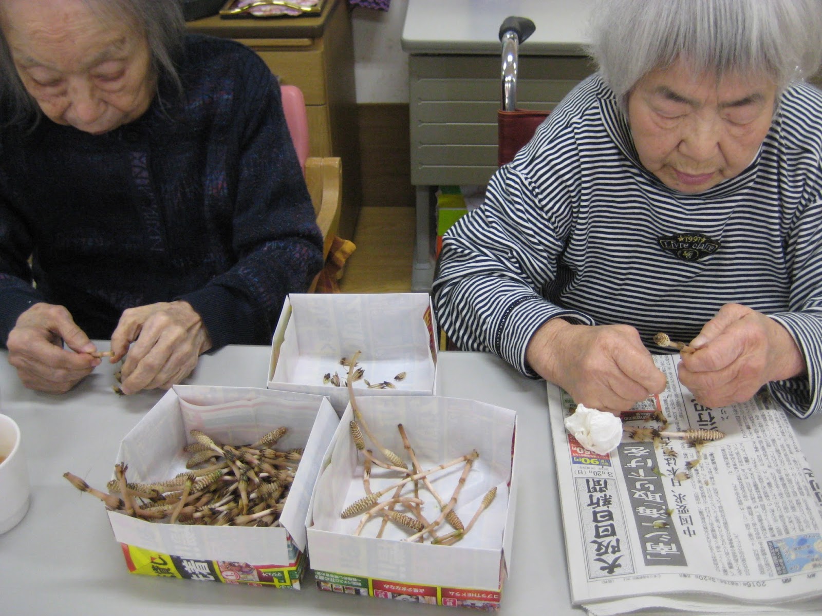 そこでスタッフが大量の「つくし」を収穫し、皆で下準備(袴掃除)をした時のご様子です。