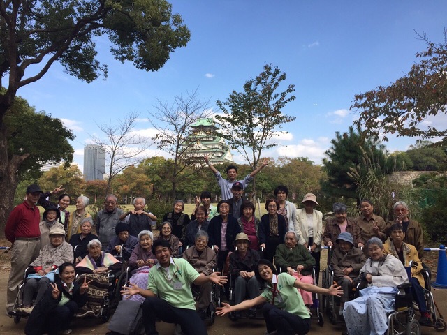 外出の機会の少ない利用者さんにとって、秋の良い季節に大阪観光No.1スポット大阪城に来られた事をとても喜んで下さり、皆さんの良い笑顔をたくさん見ることが出来ました。ハートフルかのうデイサービスセンターでは、今後も利用者さんに喜んで頂ける行事を企画しその様子をご紹介していきたいと思います。