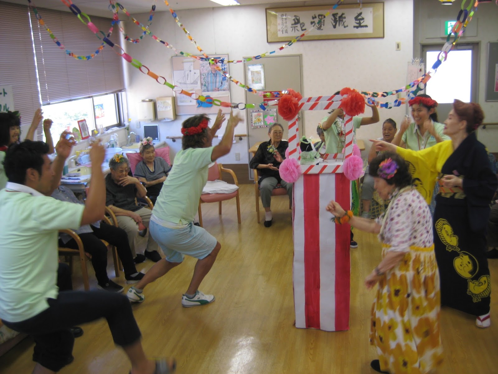 一緒に踊って下さった利用者さんはもとより、周りで見ていた利用者さんも大変喜んで下さり、皆さん大爆笑で楽しい一時を過ごして頂きました。