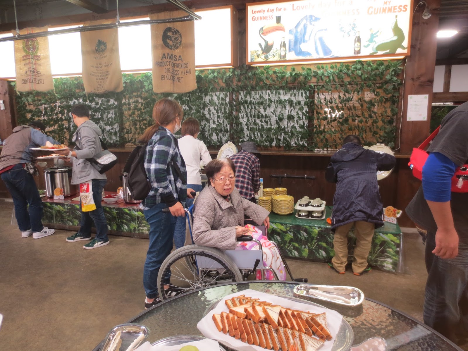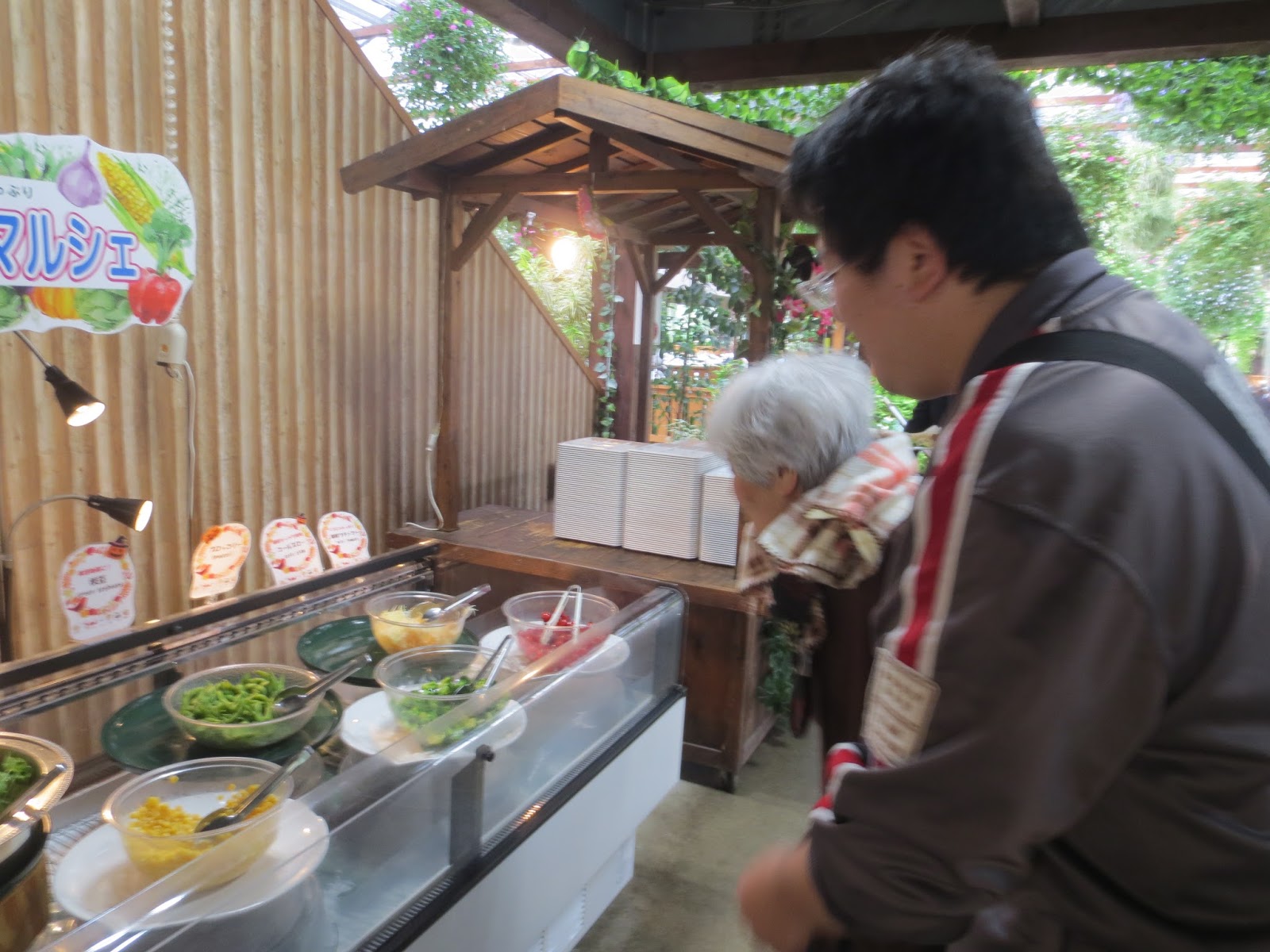到着後、早速バイキングで食事です(^_^.)入居者の方と一緒に選んでいます!!