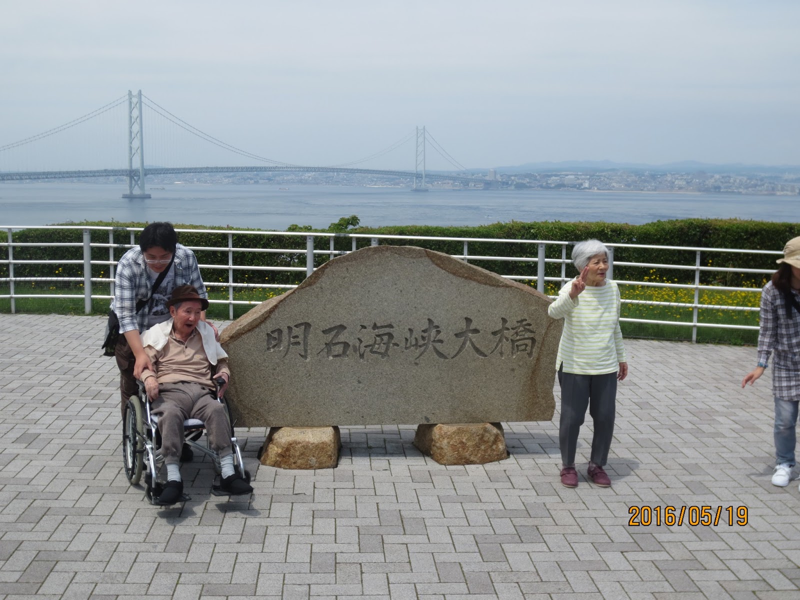 平成28年度5月より、各ユニットで外出が始まりました!最初は3階の「須磨水族園」へお出かけをしたのですが、事務員の女性が写真を上手く撮れていなかったので、ご紹介することができませんでした。またの機会に紹介させて頂きます。今回紹介させて頂くのは、平成28年5月19日(木曜日)2階ユニットの入居者の方と「淡路島」にお出かけに行きました。この日は快晴で、どちらかというと「あつい~(-"-)」といった状況でしたが、食事や明石海峡大橋等を眺めて楽しく過ごせたと思います。その様子を是非ご覧ください