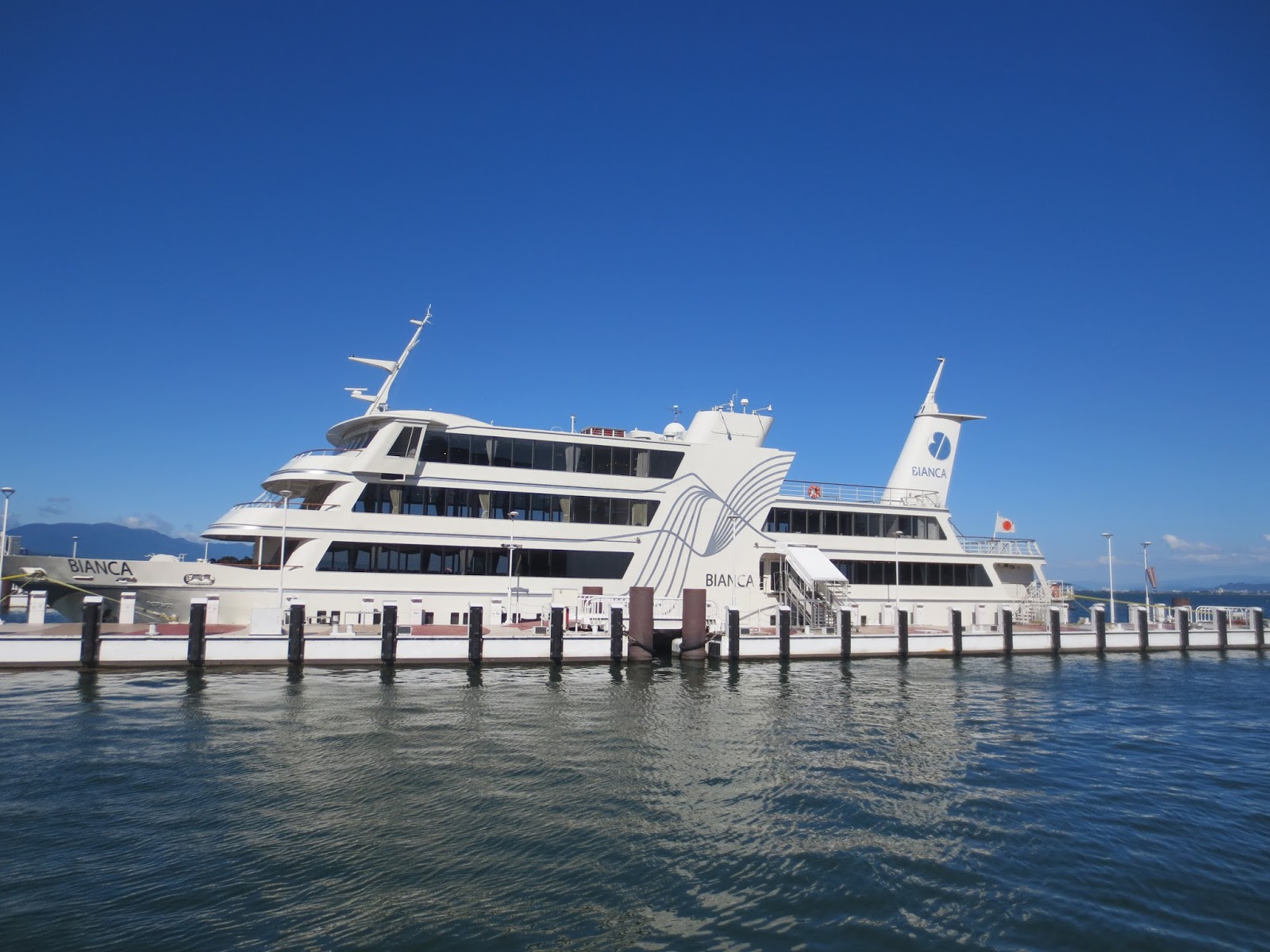 浜大津に到着しました。湖に大きな船が浮かんでいました。この船では船上で結婚式もできるようです。素敵ですね(^_-)