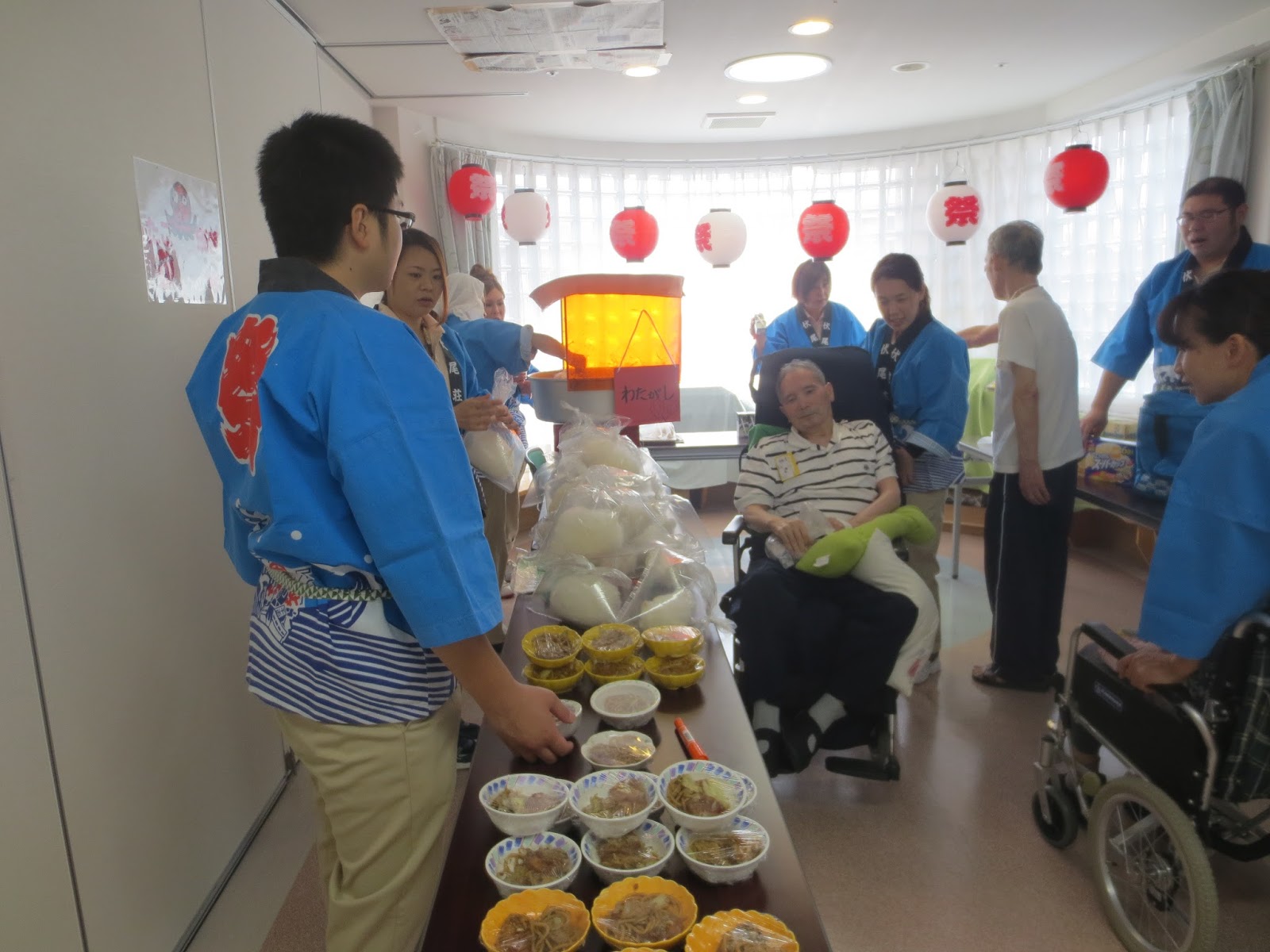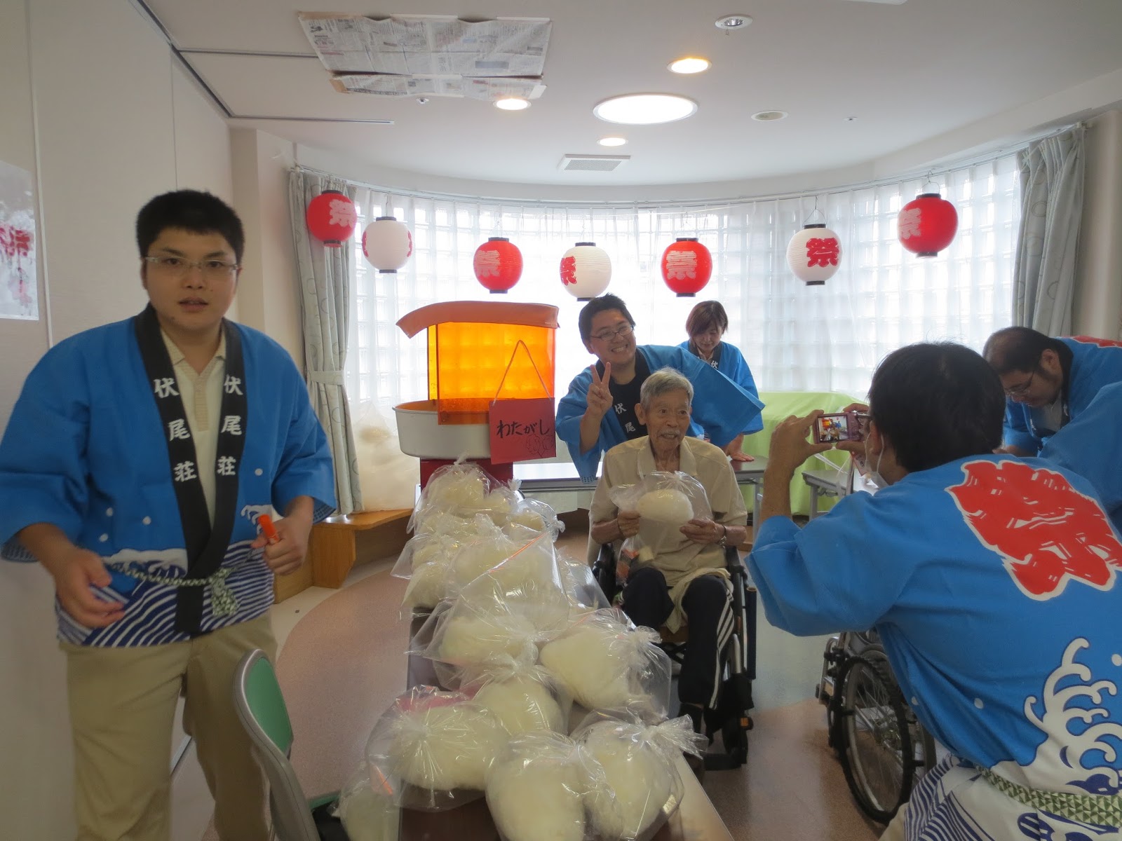 このように沢山ある食べ物を入居者の方に選んで食べて頂き、美味しく食べて頂いたと思います。約1時間程度で終了し第2部の花火見物まで時間があるので、ハートフルこうだ名物の「男神輿」で空いた時間を楽しんで頂きました(ー_ー)!!