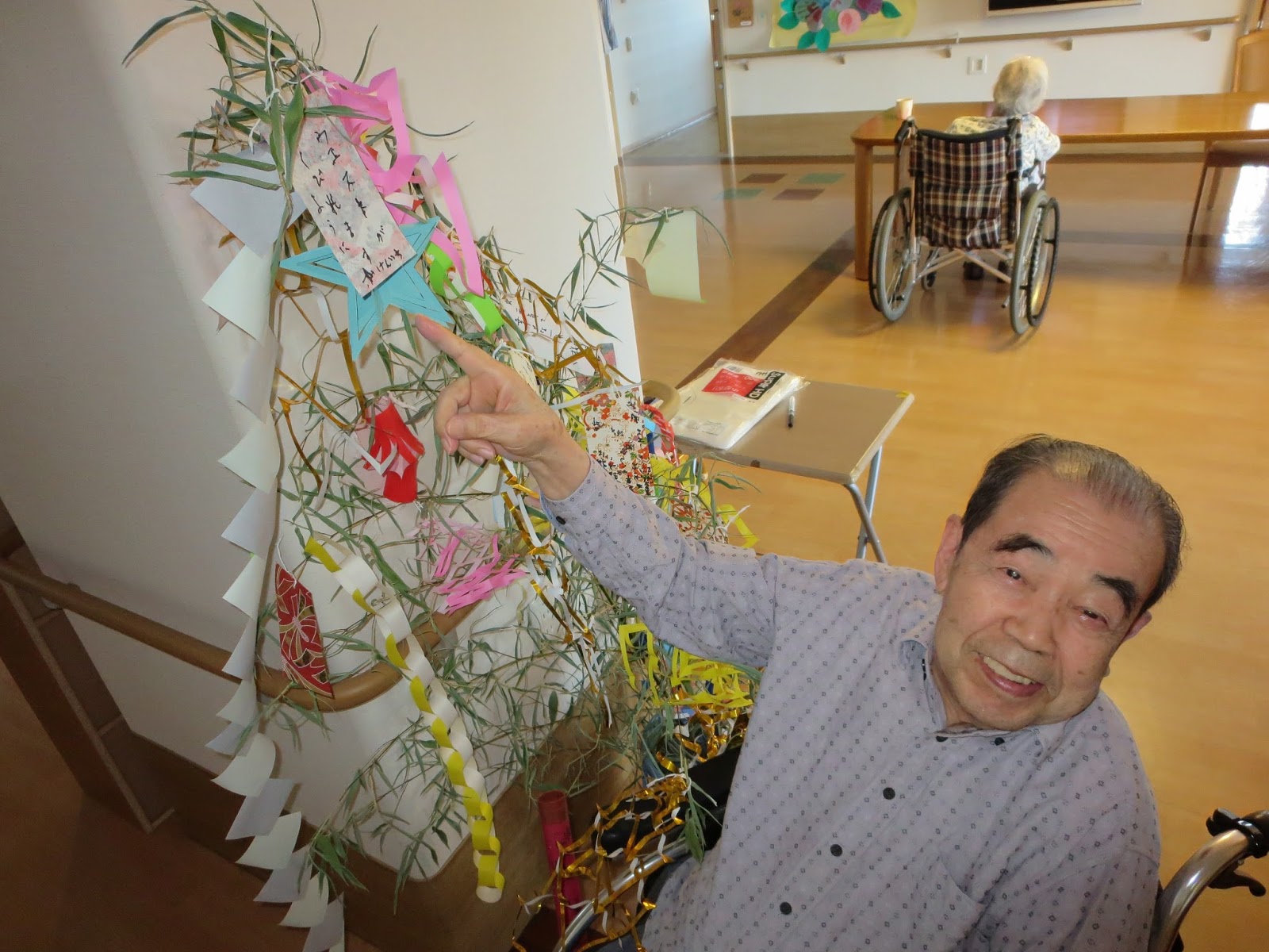 これは入居者の皆さんで七夕の飾りつけを制作しているところです。さずがに昔の方ですね!!