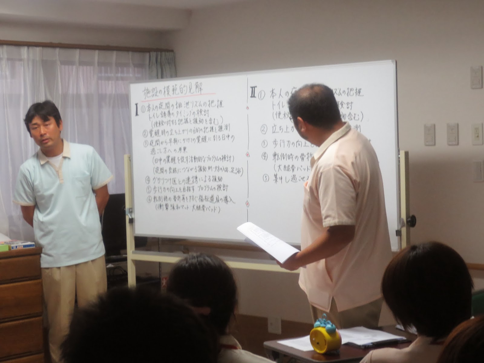 *身体拘束をされている利用者について、拘束をしない為にはどのような方法があるかをテーマに、事例検討を行っている様子です。(皆さん真面目に考えています。!(^^)!)