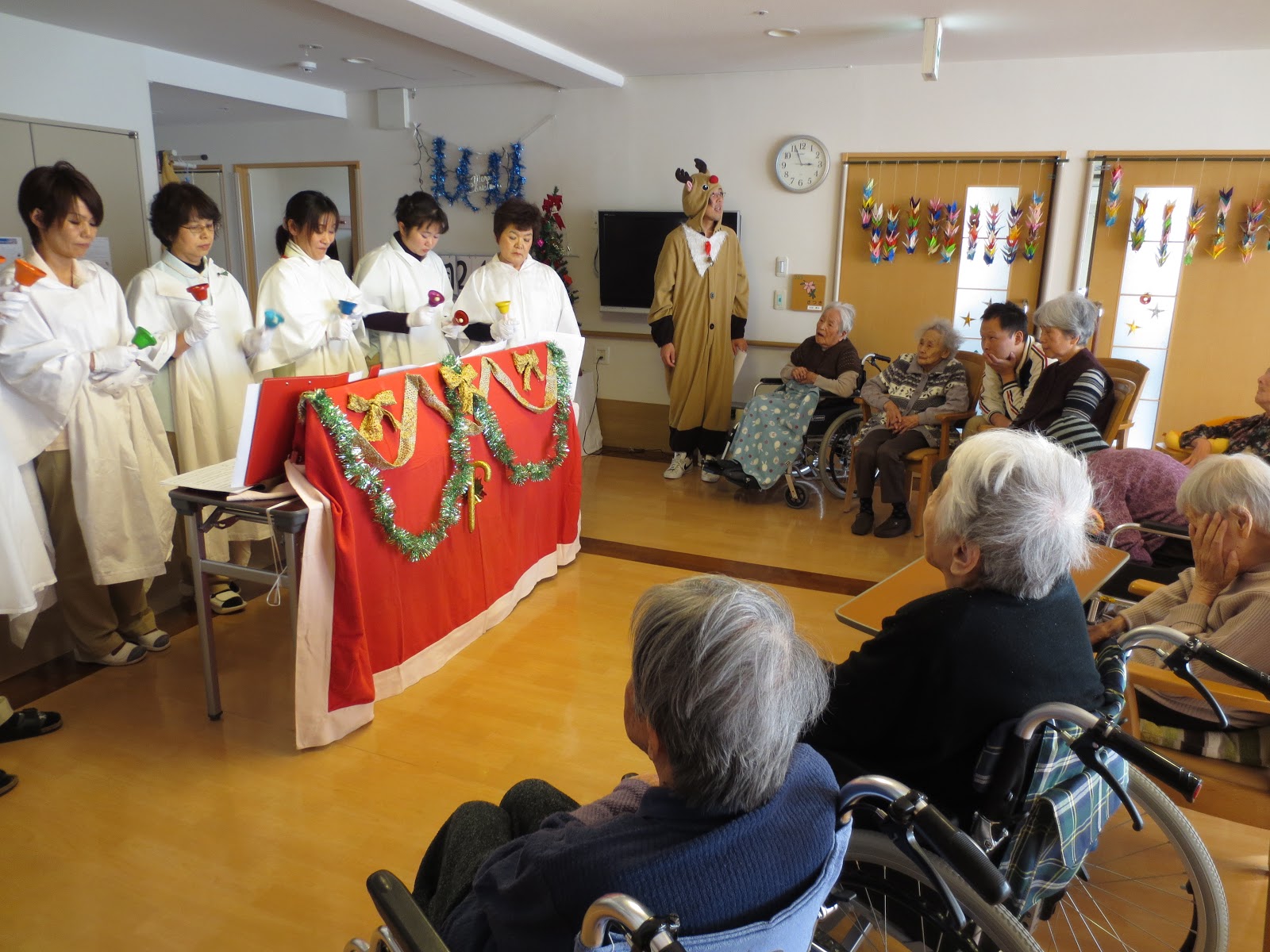 12月24日 クリスマスです。本日はハートフル神田でもクリスマス会を開催しました。サンタクロースからのプレゼントに入居者、利用者の方は大変喜んでおられました。また、職員の催し物としてハンドベルをしました。中には感動されて涙される方もおられました。